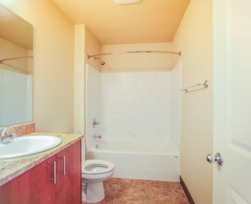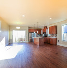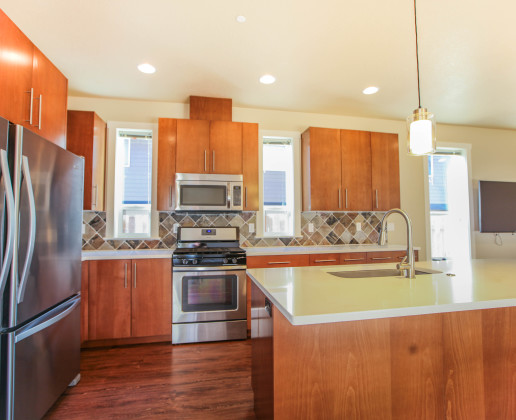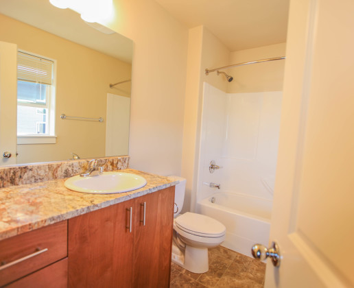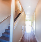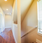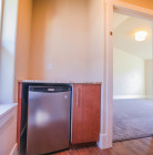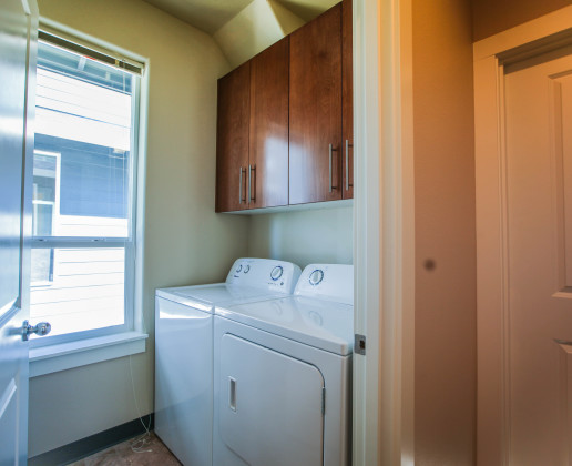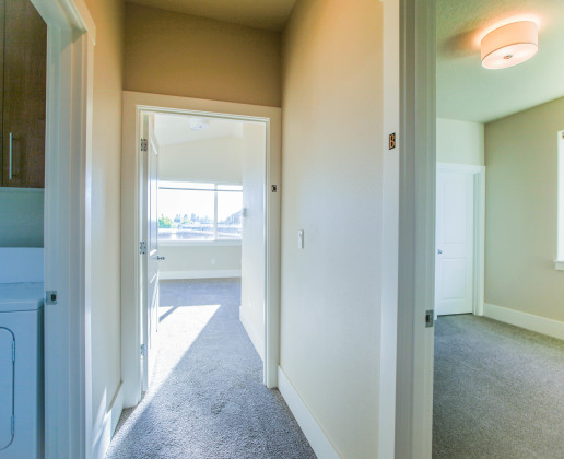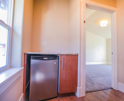 There’s an extra-wide great room with a 60″ TV (which we provide) and display shelves. The great room opens into a large kitchen with two fridges and an island with beautiful pendant lights. A sliding glass door opens to a covered porch in the fenced backyard. There’s a convenient laundry room with storage in the hall, and the garage is insulated and heated. Each room in the house has an independent heating system, so your housemates’ heating preferences won’t affect your room. Every bedroom also has ethernet and cable wiring. We’ve even included a built-in mini-fridge in the hall just outside the third-floor bedrooms. You’ll even have a secure package delivery box, so your online orders will always be safe from porch pirates.